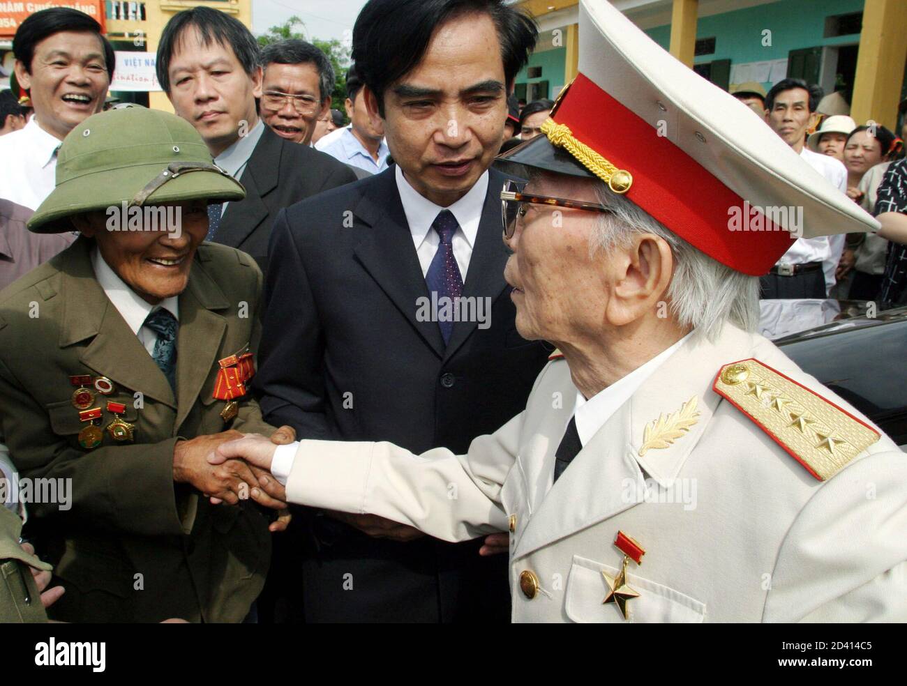 Vietnamese General Vo Nguyen Giap R Shakes Hands With A Veteran In Noong Nhai Village In Vietnam S Dien Bien Phu April 18 2004 Half A Century After General Vo Nguyen Giap Led